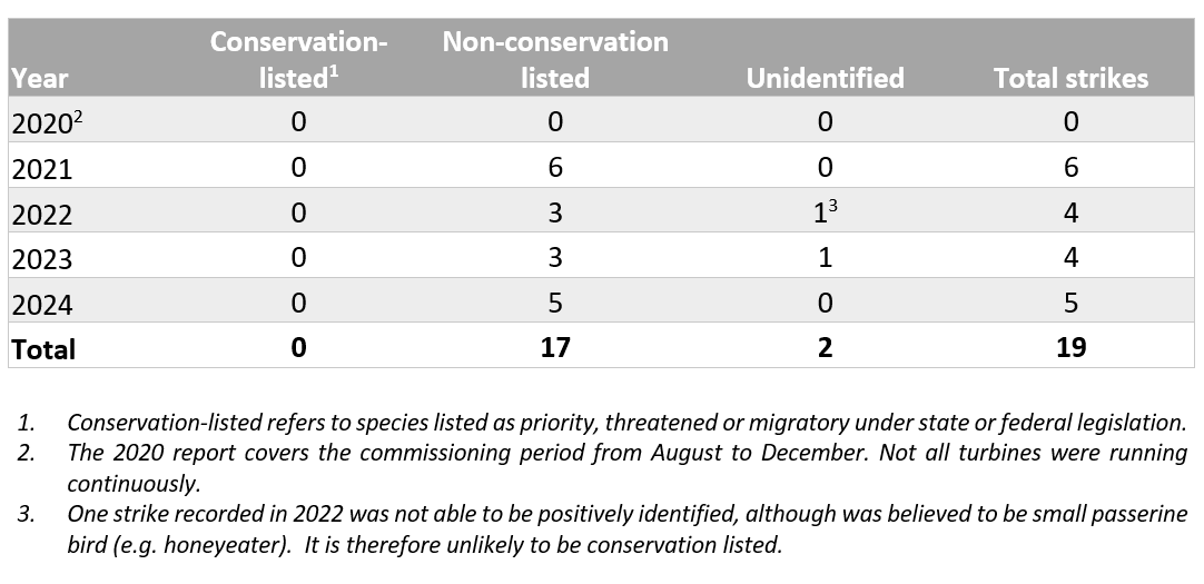 Any bird or bat strikes that are identified by wind farm maintenance personnel are recorded, collected and reviewed to determine species. No strikes have involved a conservation-listed species. The most impacted species are nankeen kestrels (7) and wedge-tailed eagles (3). Only one bat strike has been recorded (White-striped freetail bat).